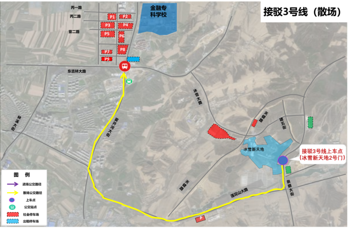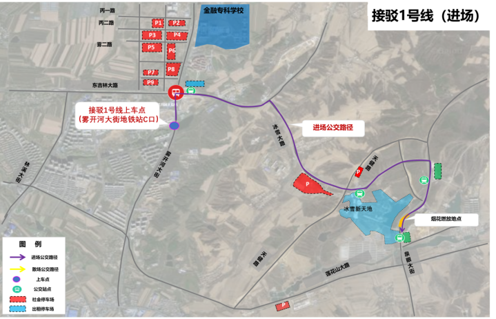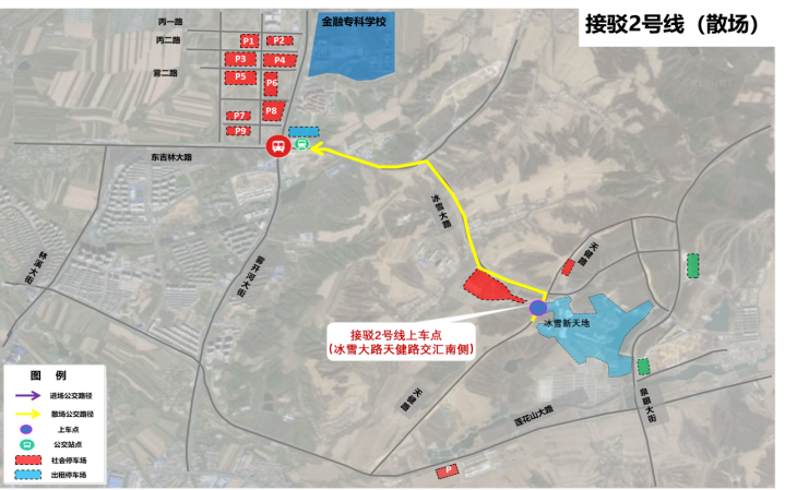 乘坐地鐵2號(hào)線在霧開(kāi)河大街站C口出站,換乘接駁1號(hào)線公交車,前往冰雪新天地1、2號(hào)門。(如下圖)