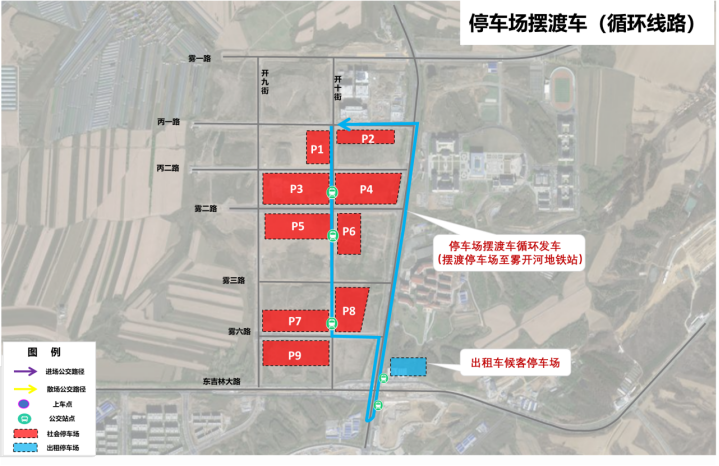 2號(hào)門:乘坐接駁3號(hào)線公交車,返回地鐵霧開(kāi)河大街站C口;換乘停車場(chǎng)擺渡車,返回臨時(shí)停車場(chǎng)。(如下二圖)