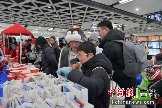 在出站口,《大東北我的家鄉(xiāng)》音樂(lè)響起,游客剛下火車便被充滿東北風(fēng)情的快閃表演吸引,免費(fèi)品嘗的凍柿子、凍梨、冰糖葫蘆,免費(fèi)領(lǐng)取綠園文旅游玩攻略和多種購(gòu)物優(yōu)惠券,讓全國(guó)各地的游客剛踏上東北的土地,就感受到的東北人的熱情。