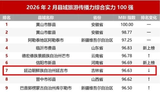 近日,邁點(diǎn)研究院獨(dú)家發(fā)布2026年2月縣域旅游傳播力綜合實(shí)力100強(qiáng)榜單,延吉市強(qiáng)勢上榜,位列第7名。