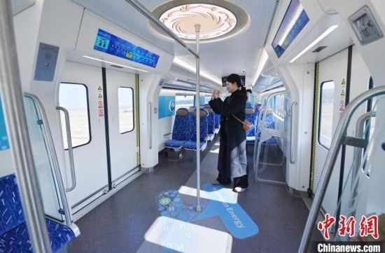 3月21日,全球首列氫能源市域列車(chē)在長(zhǎng)春進(jìn)行時(shí)速160公里滿(mǎn)載運(yùn)行試驗(yàn)。圖為列車(chē)車(chē)廂內(nèi)部。中新社記者 張瑤 攝
