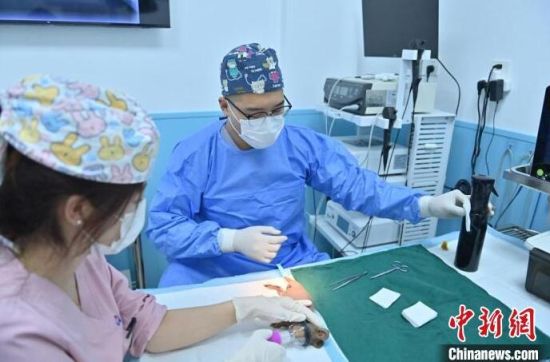 6月21日,吉林長春,周浚琦(右)給手術(shù)后的豚鼠拆線。 中新社記者 張瑤 攝