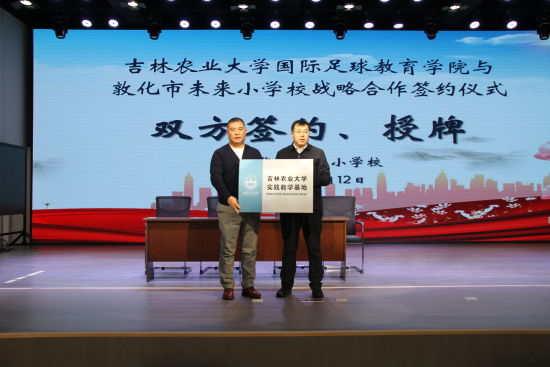 敦化市未來小學(xué)校校長(zhǎng)吳旭晶同志致歡迎詞。隨后,吉林農(nóng)業(yè)大學(xué)國(guó)際足球教育學(xué)院副書記趙立剛同志講話,介紹本次合作將以校園足球發(fā)展為核心,以課程共建與師資培訓(xùn)為重點(diǎn),著力構(gòu)建校地協(xié)同的長(zhǎng)效機(jī)制。儀式現(xiàn)場(chǎng),敦化市教育局與吉林農(nóng)業(yè)大學(xué)國(guó)際足球教育學(xué)院簽署了《校外實(shí)踐教學(xué)基地共建協(xié)議書》,吉林農(nóng)業(yè)大學(xué)國(guó)際足球教育學(xué)院張志成院長(zhǎng)授牌。授牌結(jié)束后,吉林農(nóng)業(yè)大學(xué)國(guó)際足球教育學(xué)院向未來小學(xué)捐贈(zèng)了足球訓(xùn)練裝備,以實(shí)際行動(dòng)為校園足球發(fā)展助力。與此同時(shí),學(xué)校向長(zhǎng)期支持教育的企業(yè)代表贈(zèng)送錦旗,企業(yè)代表分享了助力教育發(fā)展的理念。