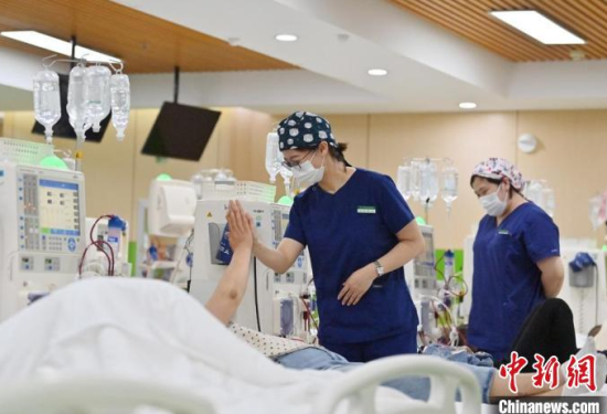 5月9日,長(zhǎng)春中醫(yī)藥大學(xué)附屬醫(yī)院腎病科門診透析室內(nèi),護(hù)士在為患者加油打氣!埇 攝