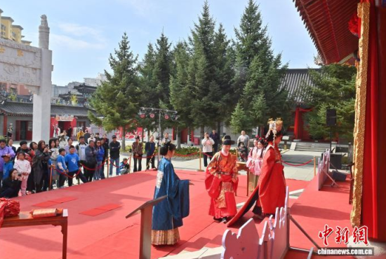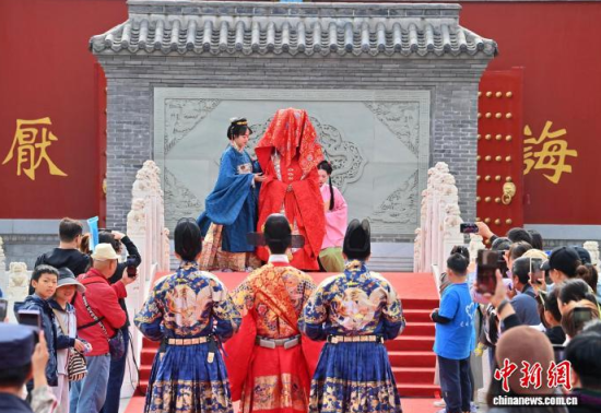 10月7日,吉林長(zhǎng)春文廟舉行了一場(chǎng)明制漢婚沉浸式展演。漢服愛好者依次呈現(xiàn)奠雁、同牢、合巹等傳統(tǒng)禮儀,生動(dòng)還原明代婚俗,F(xiàn)場(chǎng)通過流程講解與道具展示,解讀禮儀背后古人對(duì)婚姻與美好生活的寄愿。中新社記者 張瑤 攝