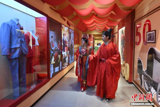 11月7日,偽滿皇宮博物院主辦的《天配良緣——近現(xiàn)代婚戀婚俗實物展》于長春開幕。展覽通過婚書、嫁妝等300余件民間實物,帶領(lǐng)參觀者沉浸式感受不同年代的婚禮婚俗。現(xiàn)場通過漢服走秀、嗩吶演奏等演出,展現(xiàn)傳統(tǒng)婚儀魅力。中新社記者 張瑤 攝