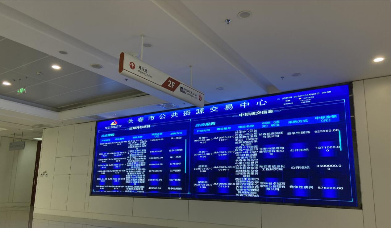 在長(zhǎng)春市政務(wù)服務(wù)中心二樓,記者看到,這里設(shè)有開標(biāo)室、澄清室等多個(gè)功能區(qū)域,LED屏幕實(shí)時(shí)滾動(dòng)著政府采購近期開標(biāo)項(xiàng)目和中標(biāo)成交信息,方便企業(yè)人員隨時(shí)查看、跟蹤項(xiàng)目進(jìn)展。