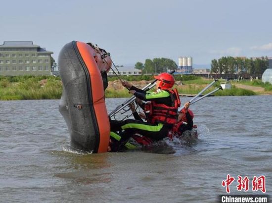 森林消防員正在進行翻舟自救科目訓(xùn)練。