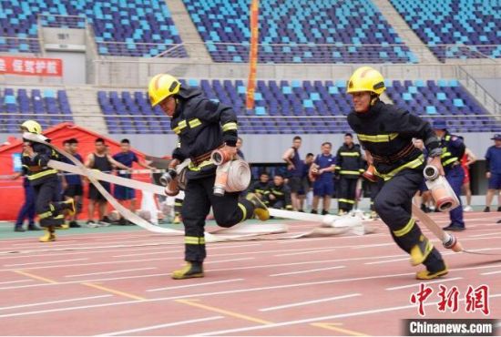 消防指戰(zhàn)員在進(jìn)行二人五盤水帶連接操!埇 攝