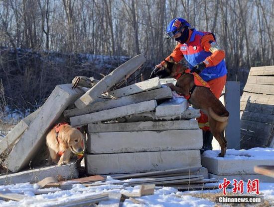 1月18日,在吉林省森林消防總隊(duì)特勤大隊(duì)訓(xùn)練場(chǎng)內(nèi),搜救犬正在訓(xùn)練。為提高搜救犬在嚴(yán)寒環(huán)境的適應(yīng)和實(shí)戰(zhàn)能力,吉林省森林消防總隊(duì)特勤大隊(duì)搜救犬分隊(duì)近期通過障礙攀登、繞腿訓(xùn)練、廢墟搜索訓(xùn)練等科目,對(duì)搜救犬進(jìn)行冬訓(xùn),進(jìn)一步提升訓(xùn)導(dǎo)員與搜救犬的默契度和技戰(zhàn)素養(yǎng)。