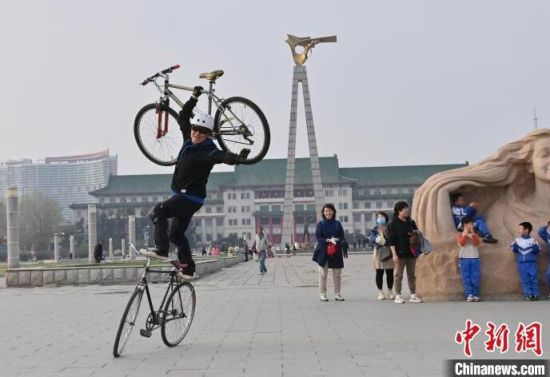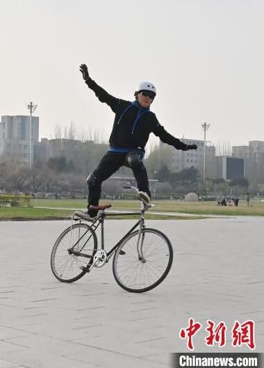 4月24日,在長春市文化廣場內(nèi),64歲的市民周長春表演自行車花樣絕技。站立騎行、脫把騎行等一系列驚險刺激的動作被周長春完成得十分精彩,吸引市民圍觀。