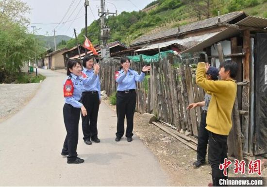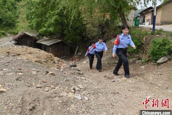 “女子警務(wù)團(tuán)”來到村里走訪。崔藝琳(右一)說,轄區(qū)里很多村子道路難行,但從沒阻止她們前行的腳步!埇 攝
