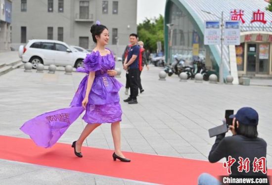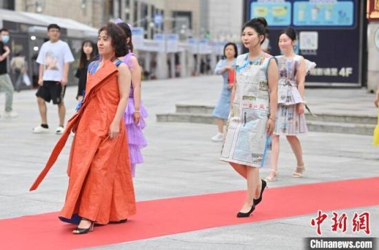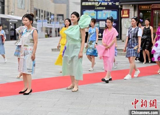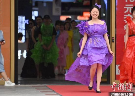 6月5日,吉林長(zhǎng)春,模特身穿綠色環(huán)保時(shí)裝走秀。值此世界環(huán)境日來臨之際,長(zhǎng)春開展“塑制霓裳·環(huán)保領(lǐng)航”綠色環(huán)保時(shí)裝秀表演活動(dòng)。民眾將廢舊的報(bào)紙、塑料袋等廢舊物品變成了美麗的衣裳,宣傳環(huán)保意識(shí)。張瑤 攝