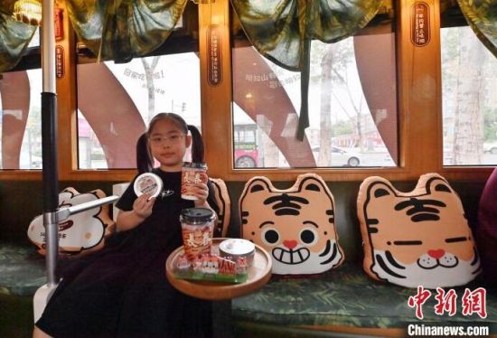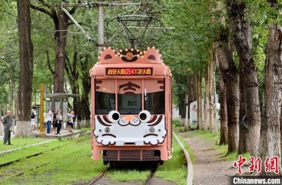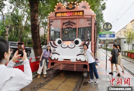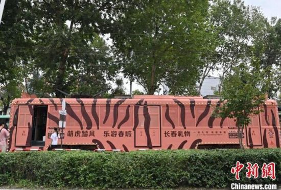 8月5日,吉林長(zhǎng)春,游客在54路文旅東北虎專(zhuān)列內(nèi)拍照。該專(zhuān)列是以“東北虎”為主題的有軌電車(chē)文旅專(zhuān)列,步入其中、綠意盈盈“森系”十足,吸引眾多游客前來(lái)打卡。(中新社記者 張瑤/攝)