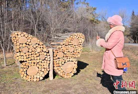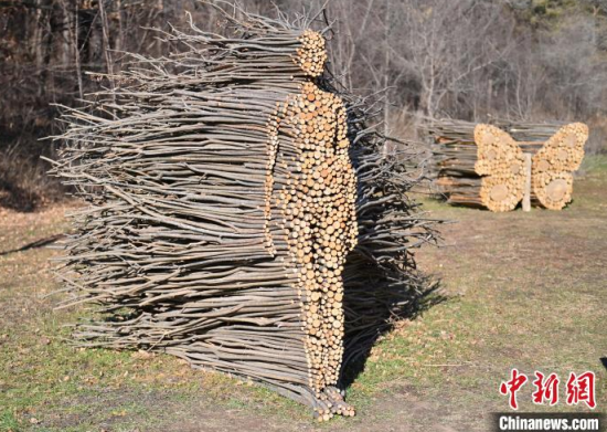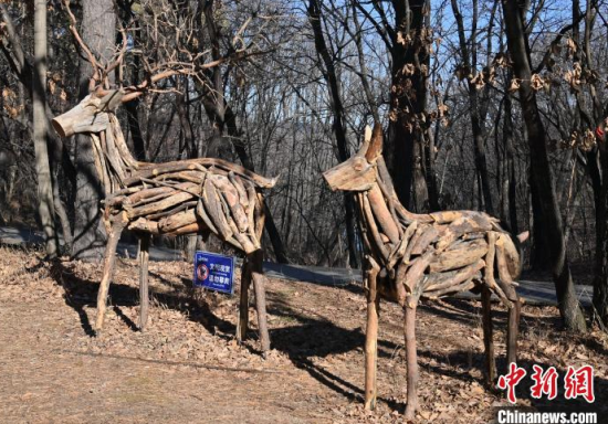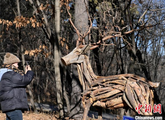 11月18日,在位于吉林長春的凈月潭國家級風景名勝區(qū)內,游客在參觀雕塑。凈月潭國家級風景名勝區(qū)的工作人員利用一個月的時間,用掉落的枯枝制作成多處雕塑,成為冬日一景。中新社記者 張瑤 攝