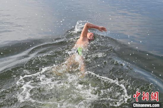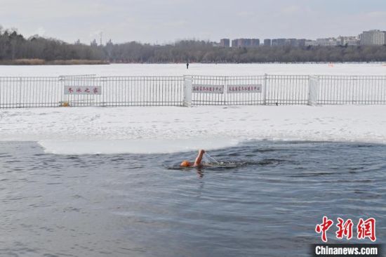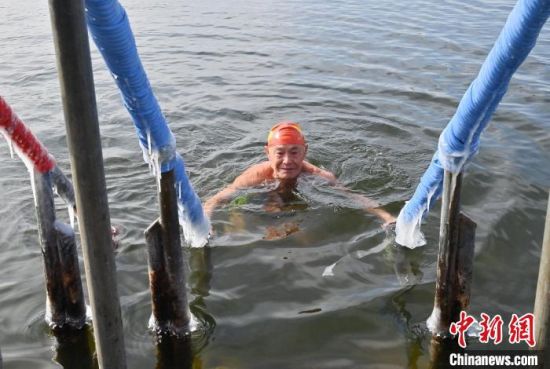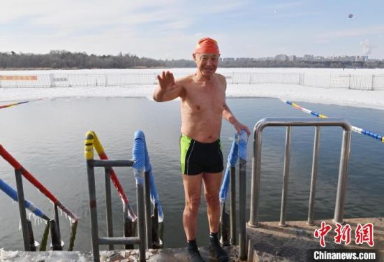2月19日,在長春南湖公園,吳長海在冬泳。中新社記者 張瑤 攝