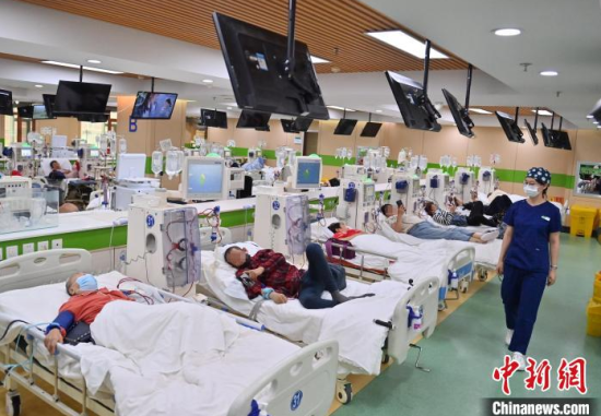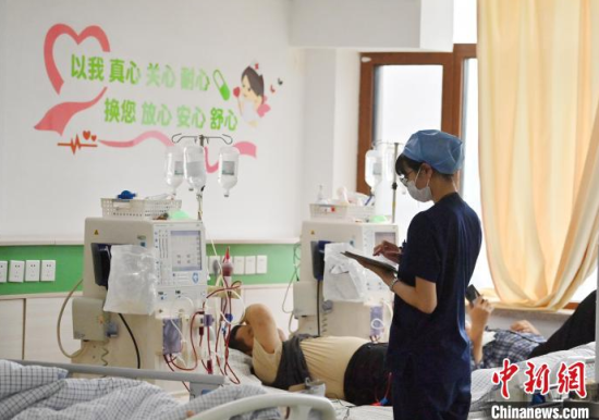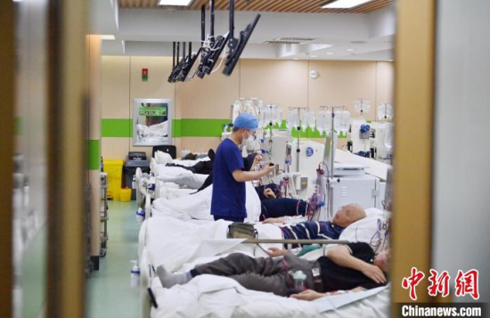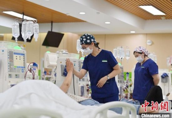 5月9日,長春中醫(yī)藥大學(xué)附屬醫(yī)院腎病科透析室內(nèi),護(hù)士在為患者進(jìn)行透析治療。該科室日均接診近200名患者,每位患者的透析過程都需要數(shù)小時(shí)。治療期間,護(hù)士們會(huì)全程密切監(jiān)測患者生命體征,隨時(shí)準(zhǔn)備應(yīng)對突發(fā)狀況。多年來,醫(yī)護(hù)團(tuán)隊(duì)以專業(yè)的技能和細(xì)致的關(guān)懷,持續(xù)為患者的生命健康保駕護(hù)航。中新社記者 張瑤 攝