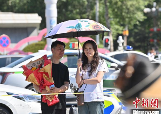 6月7日,吉林省長春市,在吉林省實驗中學(xué)考點,陪考人員為考生加油。當(dāng)日,2025年全國高考拉開帷幕。中新社記者 張瑤 攝