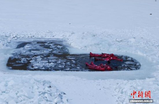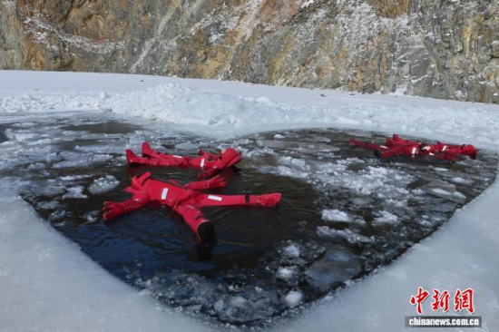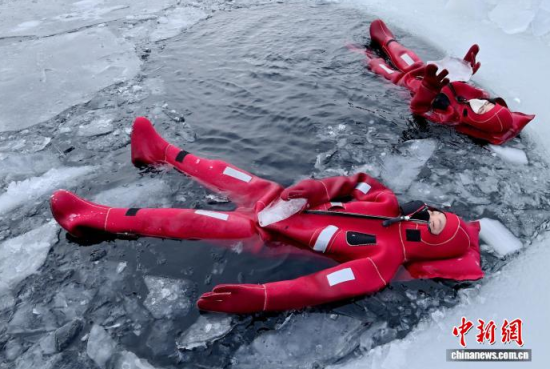 2月5日,吉林省長春市,一項(xiàng)獨(dú)特的冰浮項(xiàng)目吸引眾多游客前來體驗(yàn)。在嚴(yán)寒天氣中,參與者身穿醒目的紅色浮力裝備,悠然漂浮于冰面之上,感受別致的冰雪樂趣。圖為游客在下水前拍照留念。中新社記者 張瑤 攝