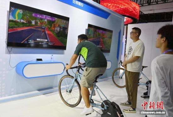 2023年8月24日,吉林長(zhǎng)春,市民體驗(yàn)比特騎行,感受數(shù)智競(jìng)技運(yùn)動(dòng)的樂(lè)趣。第十四屆中國(guó)—東北亞博覽會(huì)首次設(shè)置現(xiàn)代裝備與新能源合作主題館,集中展示人工智能平臺(tái)、新能源智能轎跑、制氫整流電源等裝備和產(chǎn)品。